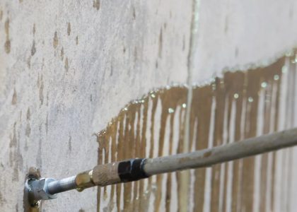 Injection grouting stops active water leaks by filling internal cracks with specialized chemical compounds. This